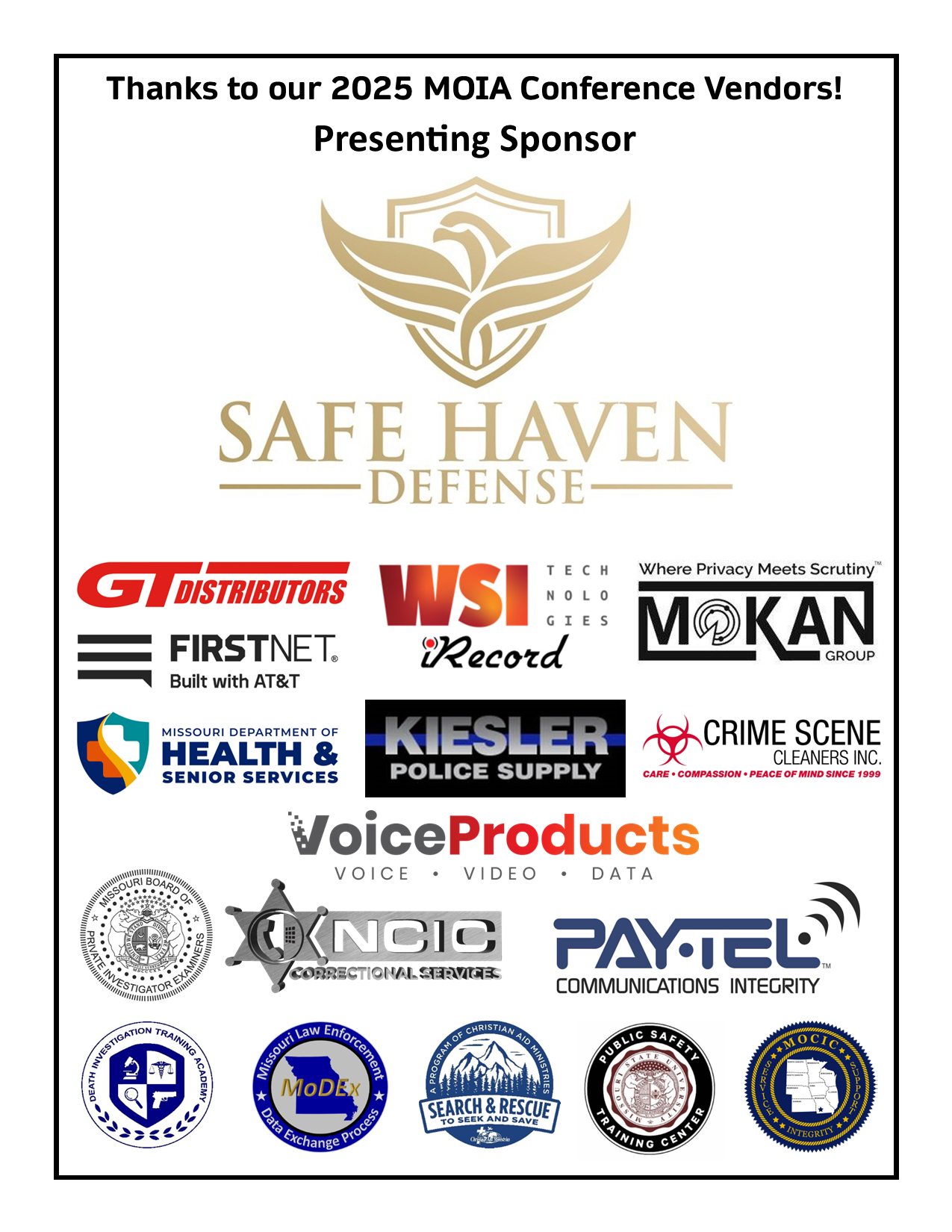 Join us for our 2026 annual conference in May at the Oasis Hotel in Springfield, Missouri. Our conference averages 125 investigators from across the State. Our vendor table fee is $250 and we also have sponsors available:
